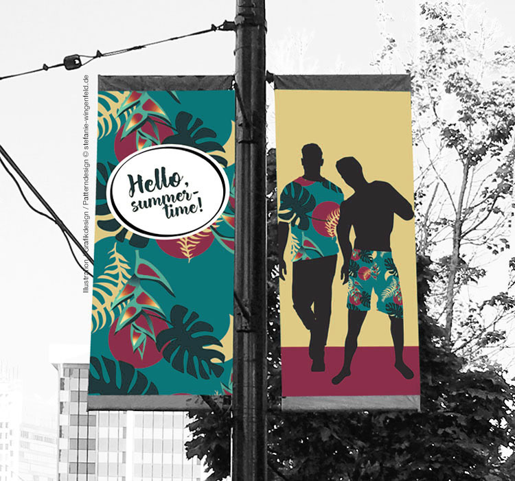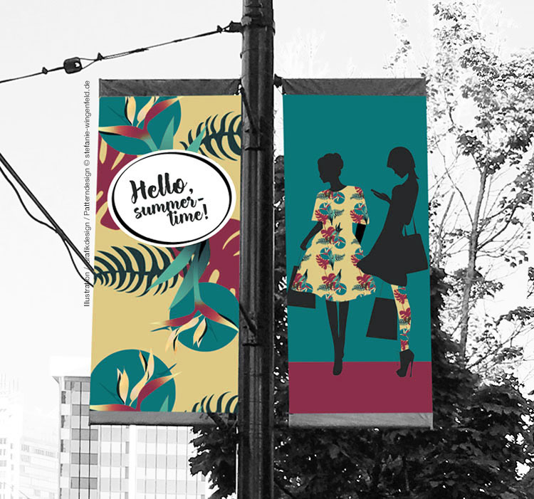 Saison-Banner als Werbung / Visual Merchandising für Einkaufsmeile, zwei Plakat-Versionen (Damen / Herren), Gestaltung inkl. Musterdesign (skalierbare Vektorgrafik). // Seasonal banner as advertising / visual merchandising for shopping mile, two poster versions (men/women), execution including pattern design (scalable vector graphics).