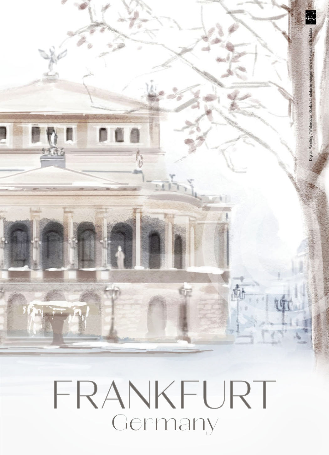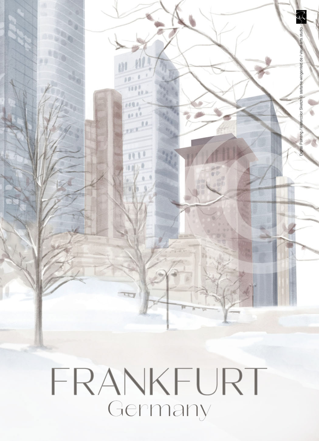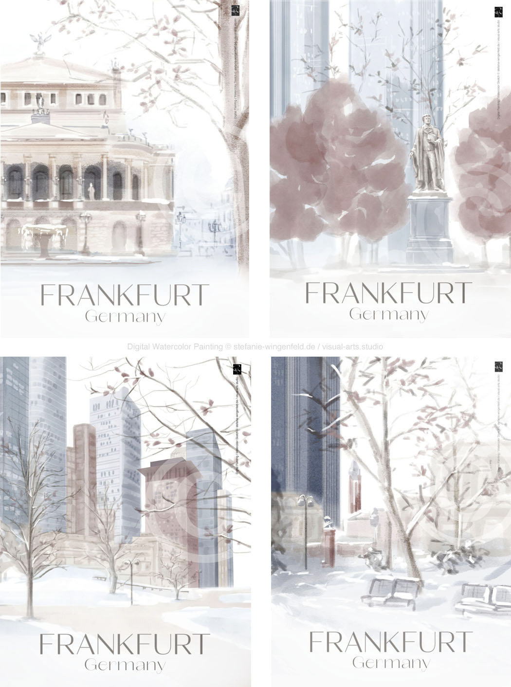 Series of winter illustrations showing city views from Frankfurt am Main (Germany). All paintings are created as digital watercolors in Adobe Photoshop. No AI.