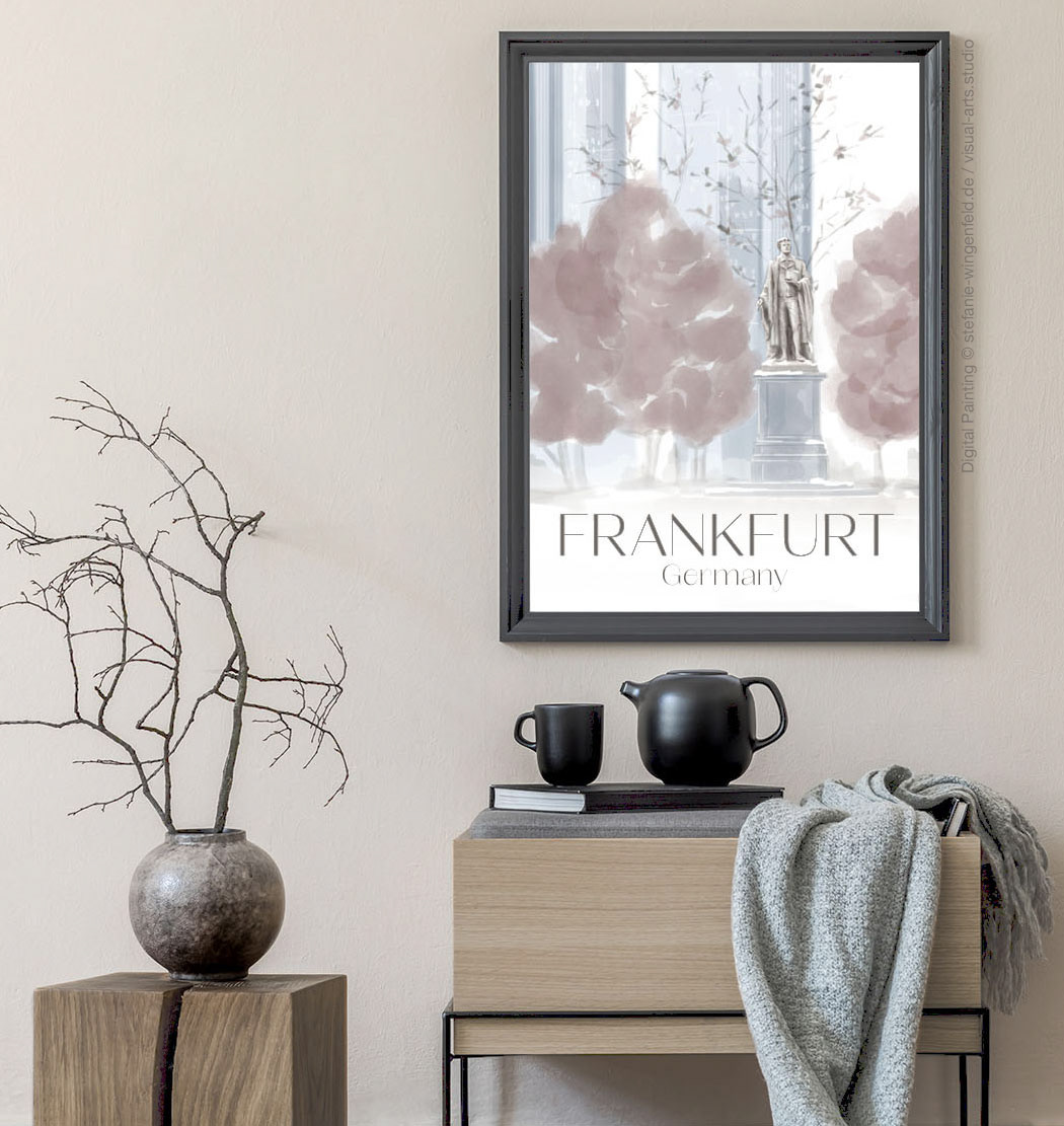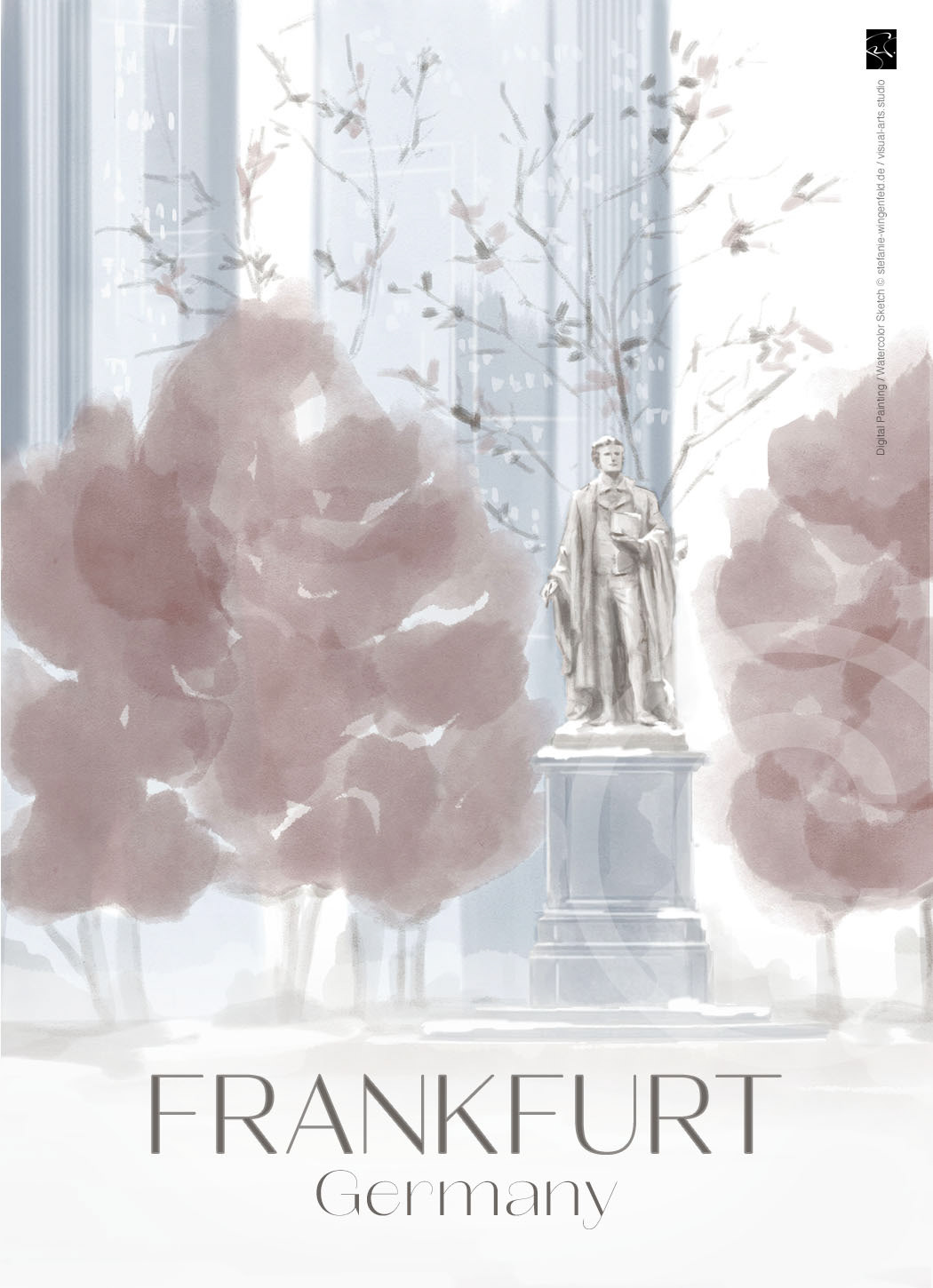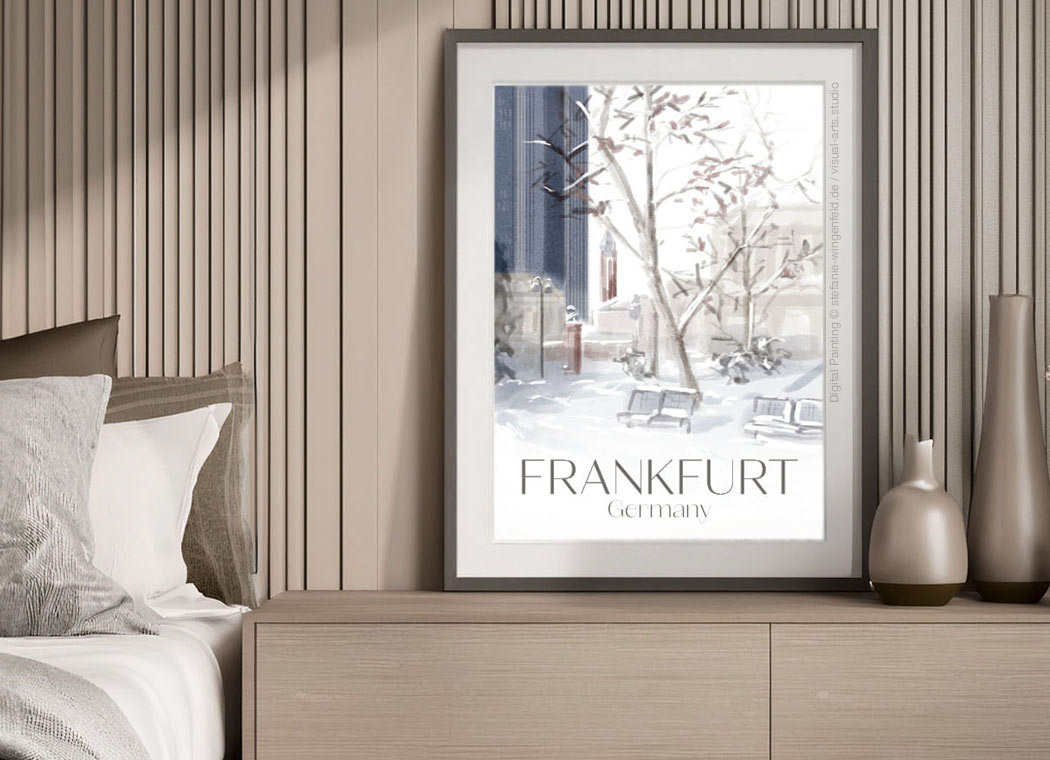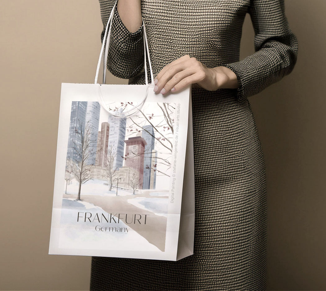 Series of winter illustrations showing city views from Frankfurt am Main (Germany). All paintings are created as digital watercolors in Adobe Photoshop. No AI.